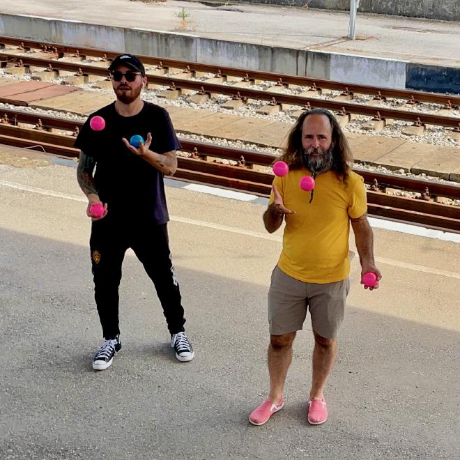 One of our twenty-minute stops for a train change turned into an hour and a half when our connecting train was late. Greg decided to do a little juggling on the platform to pass the time, and ended up teaching a few other passengers to juggle.