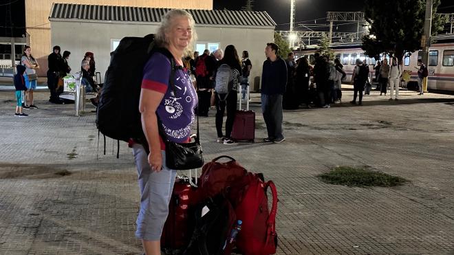We had to get our passports stamped four times: exiting Romania, entering Bulgaria, exiting Bulgaria, and entering Türkiye. The first three were easy: the border officials came on board, collected our passports, vetted and stamped them, and returned them to the conductor. Getting into Türkiye was a bit more painful: we had to exit the train with all our belongings, have our passports stamped, and then have all our bags x-rayed in the metal shed behind Karen. Meanwhile the border guards went through the entire train searching for contraband. Eventually, after about an hour and a half, we were allowed to re-board and continue on our way. Did I mention we arrived at the border about 1:30 in the morning? Yeah. Fortunately we knew all about this in advance, from reading the excellent write-up by The Man in Seat 61, whose web site is an invaluable resource for anyone travelling by train anywhere in the world.