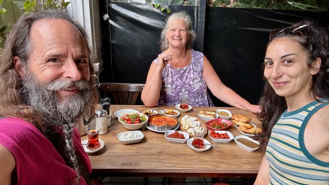 Our host, Funda, met us at the station and we had a leisurely fifteen-minute stroll to her apartment. Funda is a juggler that Greg had been introduced to at the European Juggling Convention by our mutual friend Matty from Vienna, who had lived in Türkiye for a couple of years. On the basis of a three-minute conversation (literally), Funda invited us to stay in her spare bedroom during our time in Istanbul. When we arrived she insisted on making us a typical Turkish breakfast, which we ate on her balcony. As you can probably guess, she’s a lovely, warm, kind person and we had a terrific time staying with her.