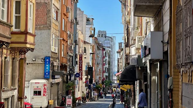 Funda has a degree in Mechanical Engineering but left that field to pursue a career in 3D computer animation. She works for an Istanbul studio that mainly contracts work on Romanian and Indian children’s shows. This is a view from her balcony. Note the varying construction styles of the surrounding buildings, including the brown one that’s covered in sheet metal on the near side.