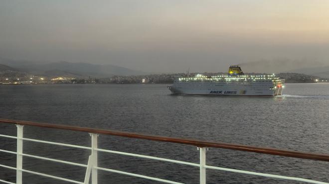 Once aboard the Nissos Samos, service was excellent. We were whisked quickly up to reception where we were issued our keys, then one of the stewards escorted us to our cabin. We’d booked a “deluxe double” for this trip as it was just a few euros more than a regular cabin and gave us a double bed rather than two singles. The room was surprisingly large and came with soft drinks, snacks, and a small case of toiletries which Greg immediately appropriated to store electronics cables. We stood out on deck while the ship was clearing the harbour, then went back to the cabin and slept most of the ten-hour voyage.