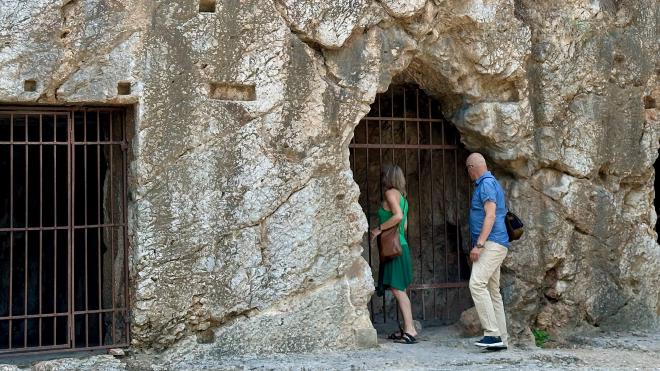 From the Areopagus we continued south, past the Acropolis, to the Hill of the Muses and the Pnyx Hill. On the near side of the Hill of the Muses is the so-called “Prison of Socrates”, ’though it’s considered unlikely this is the actual spot where he was held captive. During World War II these caves were used to store antiquities for safe-keeping, with the cave mouths being concreted shut.
