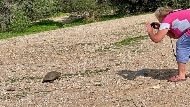 Near the Philopappos Monument we came across this Athenian citizen, out for a slow stroll. So, for a change of pace, here’s a picture of Karen taking a picture of a tortoise.