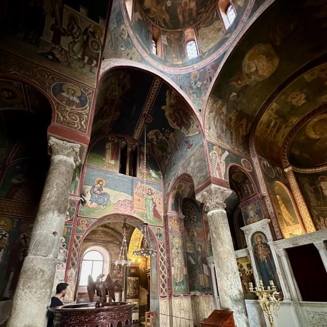 The interior of the church is entirely decorated in frescoes.