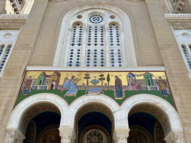 A few blocks further along we came to the much larger Church of Theotokos Gorgoepikoos and Ayios Eleytherios, which features this mosaic above its entrance.