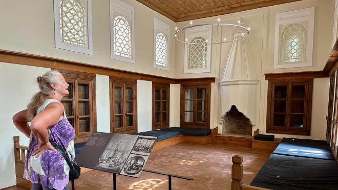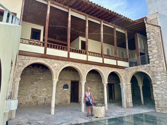 From the churches we went to the Benizelos Mansion, also known as The Oldest House in Athens. This is the oldest remaining example of the konaki or “urban mansion” style of home, common in the Ottoman Empire from the middle of the 17th century. This is the front courtyard. The lower level is mostly storage and utility spaces; the main living quarters are on the upper level.