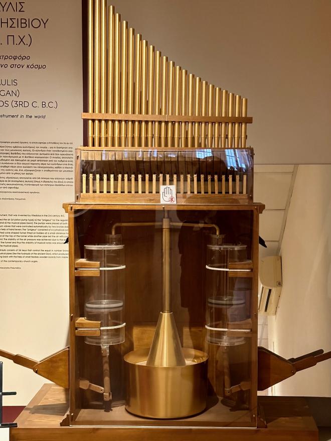 We visited the museum of instruments and toys first. This is a reproduction of the Hydraulis, the first known keyboard instrument, invented by Ktesibios in the 3rd century BCE. It is a precursor of the modern pipe organ that uses a hydraulic system to ensure constant air pressure. In order to play it, two people need to pump the levers on either side of the organ. The museum included a video of the Hydraulis in operation, playing from an ancient Greek score that was allegedly musical. Perhaps something was lost in transcription.