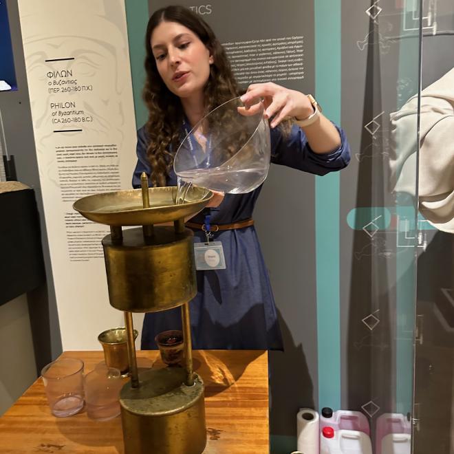 The Museum of Ancient Greek Technology was staffed by an enthusiastic cadre of demonstrators, all of whom seemed to be university students. This is Maria, explaining the oldest known vending machine, which dispensed a small quantity of holy water in return for a five drachma coin.