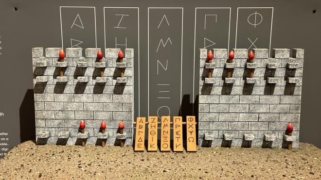 Greg enjoyed this early digital signalling system, dating from the 2nd century BCE. Operators on two adjacent mountain tops would first synchronize by raising and lowering two torches. Then the sending operator would put torches up on each of the two walls. The number of torches on the left-hand wall indicated which letter panel was to be used, and the number of torches on the right signalled which row from that panel. So, for instance, four on the left and three on the right signalled Σ. By repeating this process, arbitrary messages could be sent, albeit slowly.