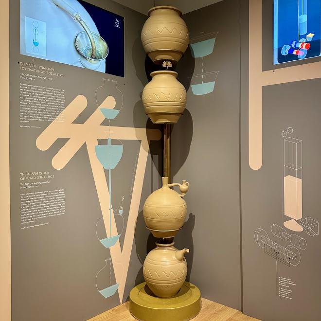 This is Plato’s alarm clock from the 5th century BCE, the oldest known example of an automatic waking device. The top vessel was filled with water, which was allowed to drip slowly into the second vessel at a predetermined rate. When the second vessel filled this triggered an axial siphon that rapidly emptied the water into the third vessel. This vessel was airtight other than a whistle, so that as the water rushed in, air rushed out and the whistle sounded. Maria demonstrated this for us as well and we can guarantee you wouldn’t sleep through the noise.