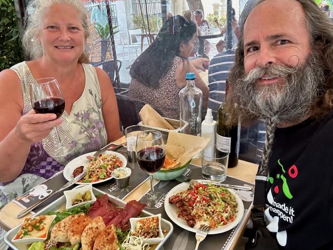 From the museums we headed back to our apartment via the Eatery Bairaktaris Aiolou 29, where we had a very nice meze dinner including salad, souvlaki, a variety of spreads, cheeses and vegetables, and some excellent Greek wine.