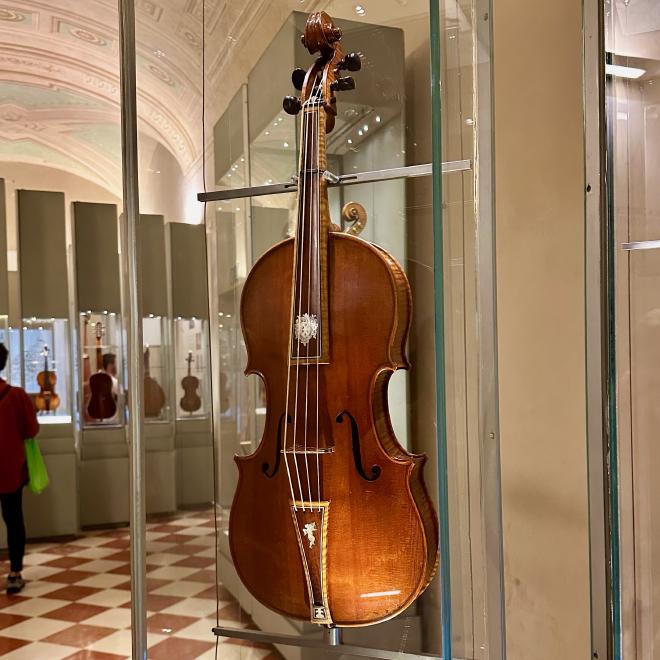 The Galleria also houses an exhibit of musical instruments, most originally owned by the House of Medici. This is a tenor viola fabricated by Antonio Stradivari in 1690. Once a common part of string quartets, the tenor viola is now extremely rare.