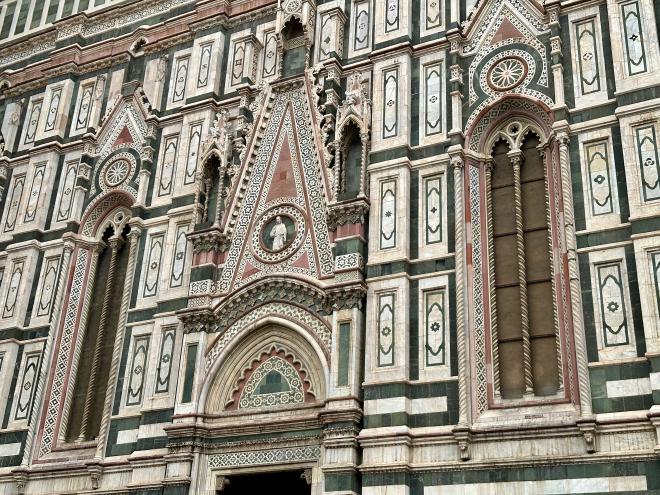 The original intent was that the Duomo complex would be sheathed in white and black marble with red accents. However, black marble was simply not to be found, so a dark green marble was used instead. The carvings and the intricacy of the marble inlays on the exterior walls are breathtaking.