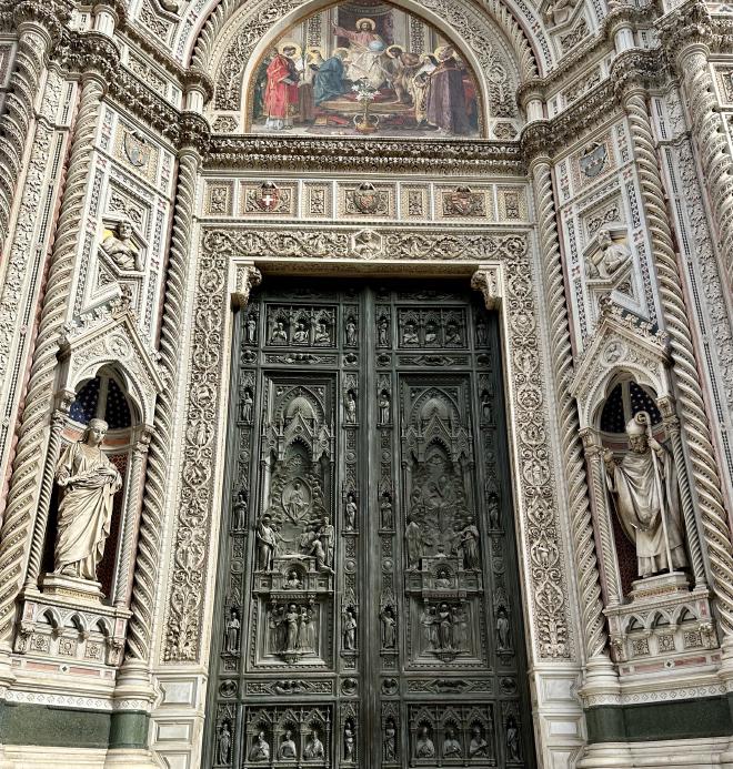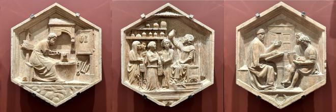 The east wall of the Duomo includes representations of various professions, carved in the workshop of Andrea Pisano about 1350. The originals are now in the museum. We managed to find the professions of each of our kids represented amongst them. Left to right: metalworking (Tristan, welder), medicine (Shona, nurse practitioner), and grammar and rhetoric (Jared, writer and editor). We were unable to find either a bellydance teacher or a software engineer, so that’s us out.