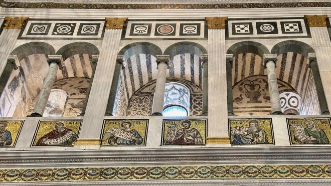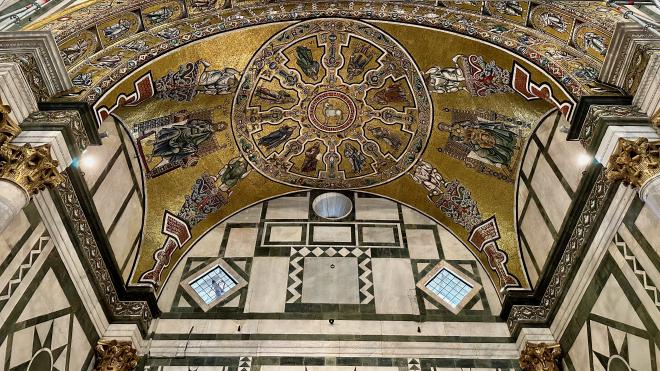The ceiling of the Baptistery is covered by a spectacular mosaic. Unfortunately the mosaic is entirely obscured by scaffolding and tarpaulins, as a multi-year restoration and conservation effort is in progress. Smaller mosaics on the walls…
