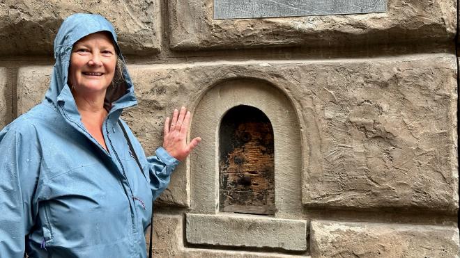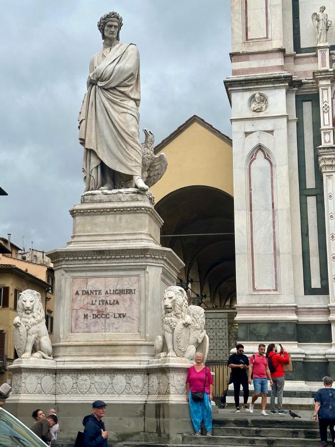 At the corner of the Basilica is a modest statue of poet Dante Alighieri, author of the Inferno. To show just how modest, we have Karen for scale.