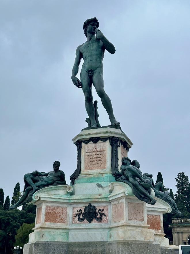 One of the main features of the Piazzale Michelangelo is a full-size bronze replica of the David statue, crapped-up (in our humble opinion) by the addition of other statues on its plinth.