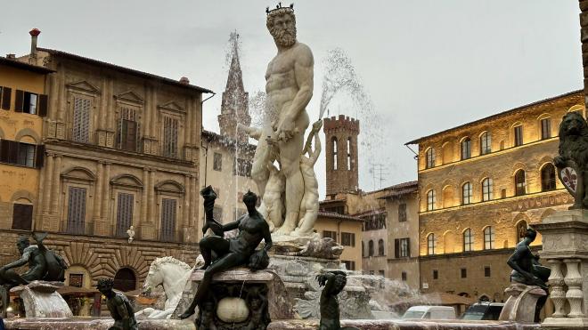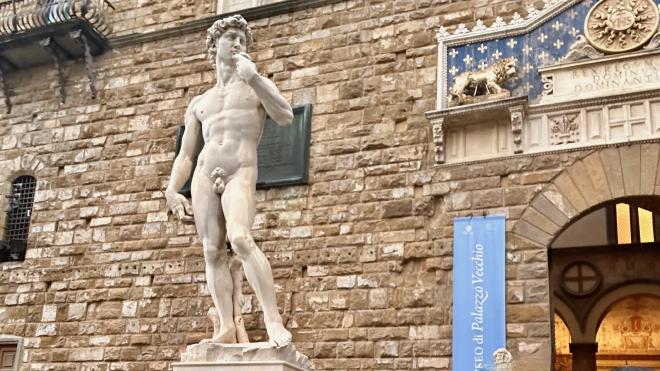 At the Palazzo is a full-sized marble replica of Michelangelo’s David. This is where the original stood from June 1504 until August 1873, when it was moved into the Galleria Academia to protect it from the elements. Since the statue is 5.17 metres high and weighs 8.5 tons, this was a bit of a delicate undertaking, requiring twelve days. Recent investigations have shown that the original has weak ankles and that tilting it 15º would be enough to destroy it.