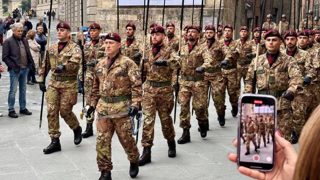 The first stop on the tour was Sienna. Our guide brought us to Piazza Salimbeni which is where we were to meet her at the appointed hour. While we were getting ourselves organized, a unit of Italian airborne soldiers marched past, preceded by a brass band.