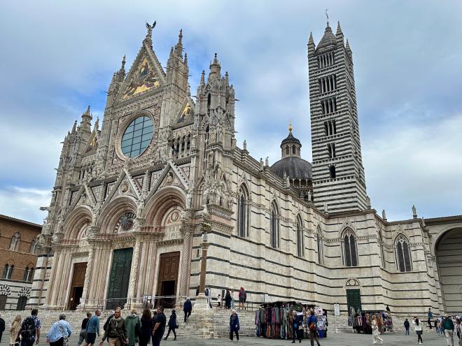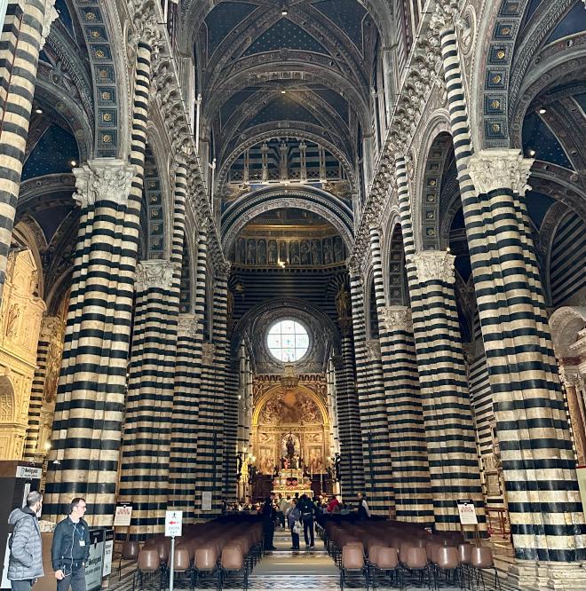 We didn’t visit the interior, but were able to look in through the central door. Unlike the Florence Duomo, the Siena Duomo’s interior design echoes the polychrome marble of its exterior.