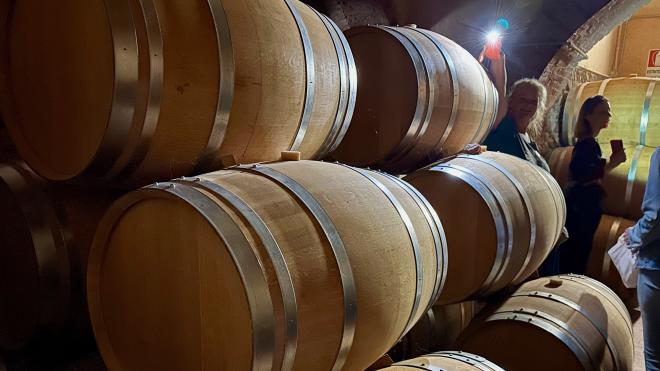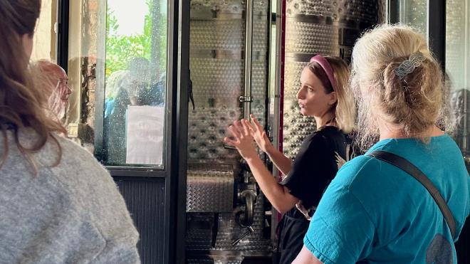 The visit included a tour of the production facilities and cellars, plus a guided tasting of four of their wines. There was a power outage in the entire village during our visit, so we toured the cellars by flashlight.