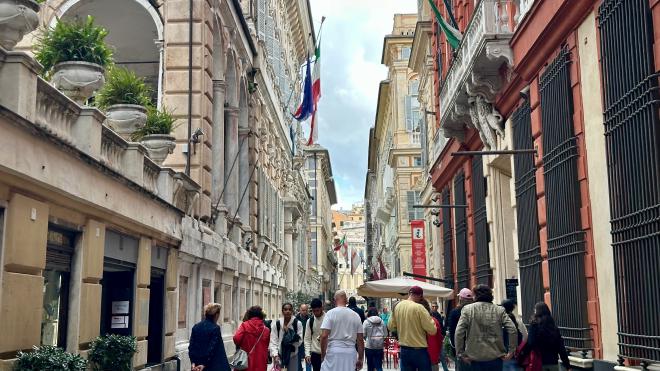 Via Giuseppe Garibaldi was built between 1558 and 1583 and contains a dozen Genoese palazzos on the UNESCO World Heritage List. The red building at right of the photograph is the Palazzo Rosso.