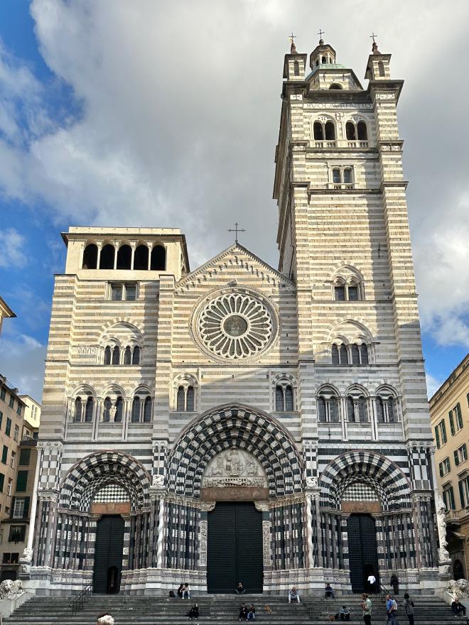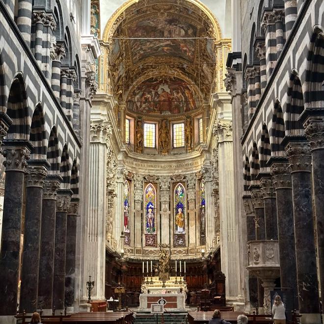 On the way back we visited the Cattedrale di San Lorenzo (Genoa Cathedral), built between the twelfth and fourteenth centuries in a mix of romanesque and gothic styles, having burned and been partially restored along the way. It was accidentally shelled by the British during the second world war, but the armour-piercing shell failed to go off in the relatively soft building material and is still in the Cathedral.