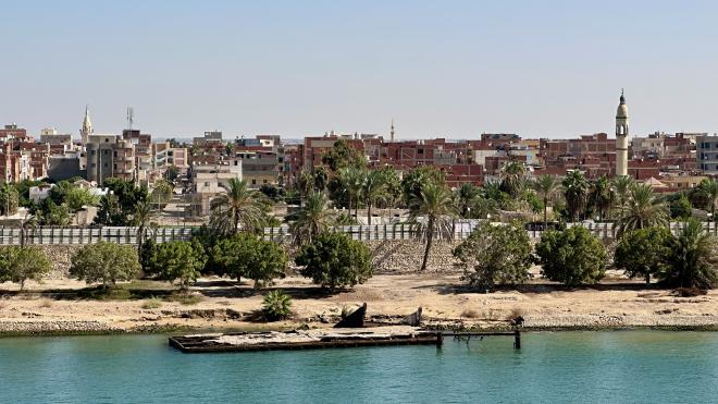 Much of the Canal is lined by desolate desert, but we did pass several fair-sized cities. The wall you can see in the foreground is part of a defensive work that runs almost the entire length of the Canal on its eastern side.