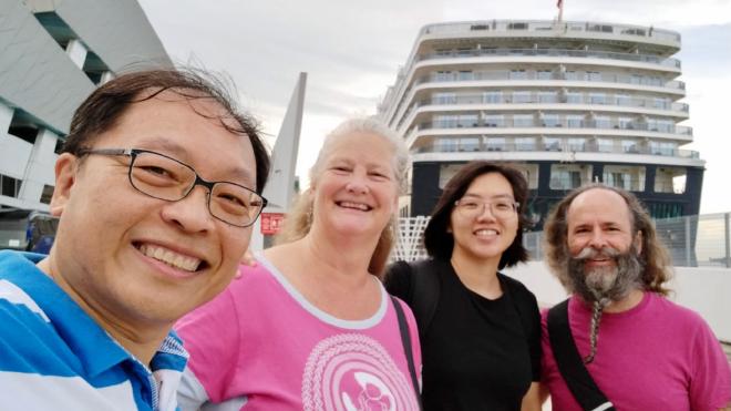 Koah Fong (left) picked us up right at the cruise dock, with Chia. There were many hugs. That’s the Queen Elizabeth behind us. (LKF)