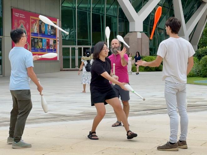The main reason for our visit to the Esplanade is that it’s a nice spot to juggle, and in fact the juggling club has performed in the main building on several occasions. This is Koah Fong teaching Greg a simple five-ball “mini” passing pattern, which was a lot of fun. For the jugglers: Prechac 3331p. Behind us, Chia passes with Di Hong (off camera).
