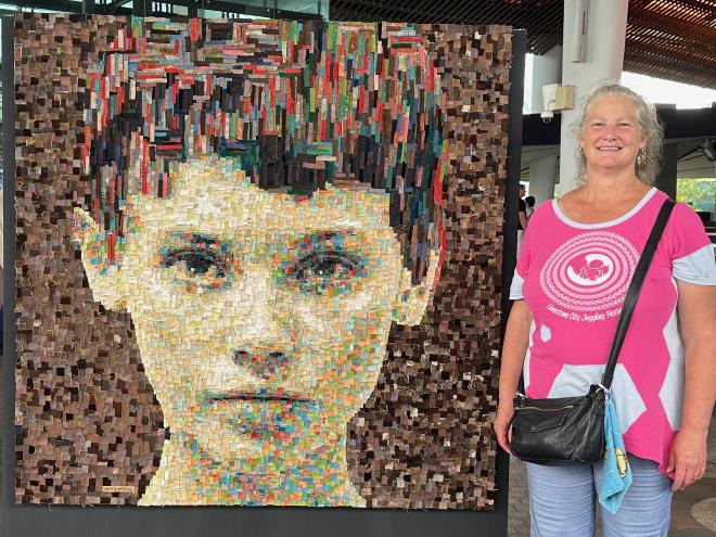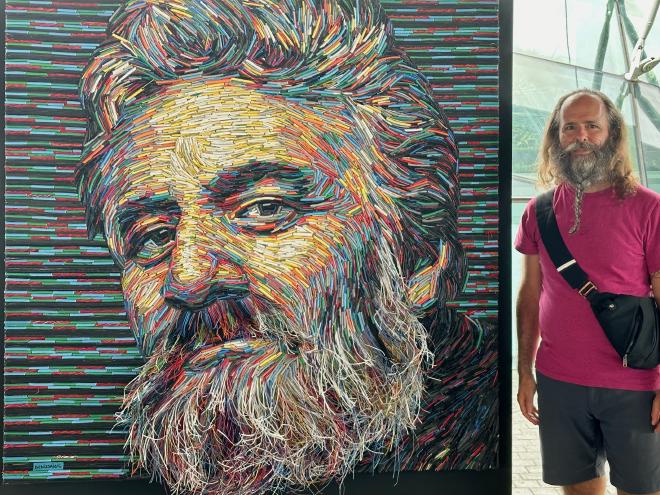 After lunch we went to the Gardens By the Bay, which is a large park and botanical gardens. In the lobby area was an art exhibit called Ready Remade, consisting of portraits made from waste materials. This one is by Deniz Sağdiç, from waste cable pieces.