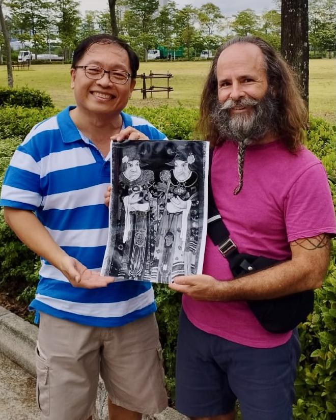 And speaking of back on the ship, that (sadly) was our next destination. Before we left, Koah Fong gave us a packet of a unique Singaporean treat, Irvins Salted Egg Fish Skin. He also gave Greg this photograph, which he took, and printed in a darkroom, about thirty years ago. It shows the two Menshen or Door Guardians on doors at Thian Hock Keng. In this depiction, which has since been painted over (boo!) it appears as though the Guardians are juggling lotus flowers.