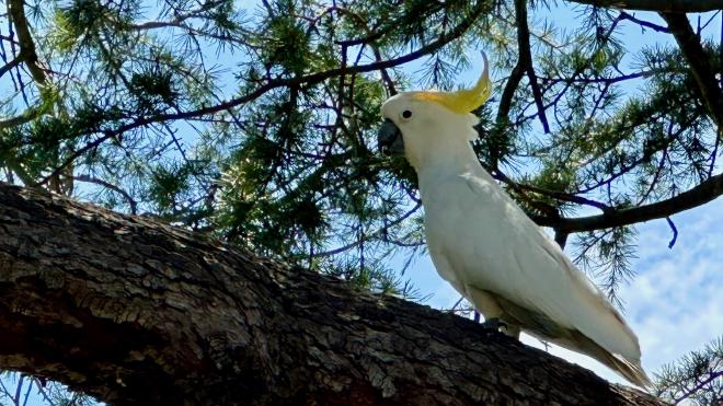 From the Cafe we hiked to our apartment, a distance of about two kilometres. Along the way we passed this Greater sulphur-crested cockatoo. Cockatoos are widespread in eastern and northern Australia, and are very happy to live in suburban environments where they’re known for opening garbage cans and destroying the wood on decks. They’re also extremely loud!
