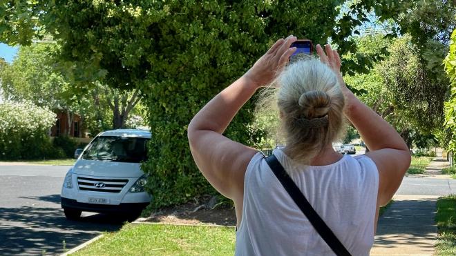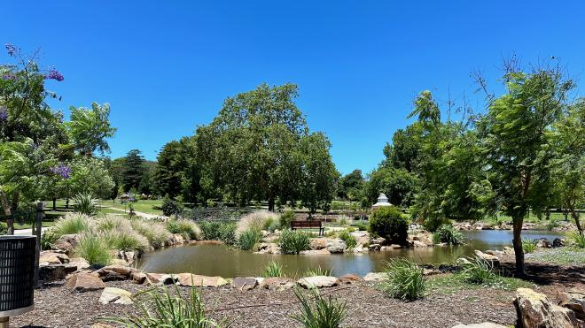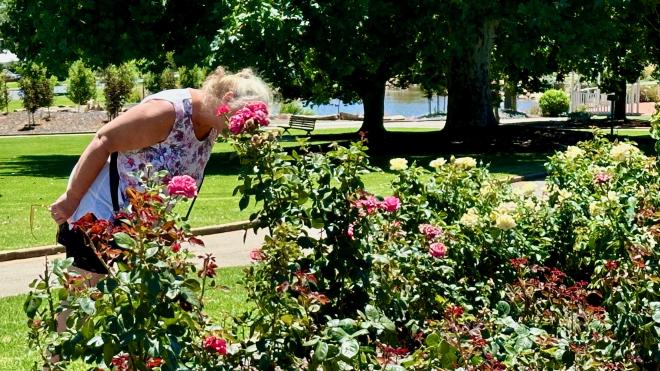 Around noon we headed out to visit the City of Wagga Wagga Botanic Gardens. Near our apartment we passed this tree, which Karen had noticed when we were grocery shopping the day before. Here’s the usual picture of Karen taking a picture of a plant.