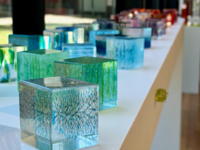 Adjacent to the main gallery is a second gallery, long and narrow with lots of windows, that’s entirely displays of glass art. This piece, by Yugoslav-born Australian artist Emma Varga, consists of fifty glass cubes, each representing a significant moment in the last fifty years of her practice.