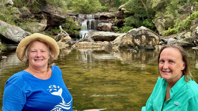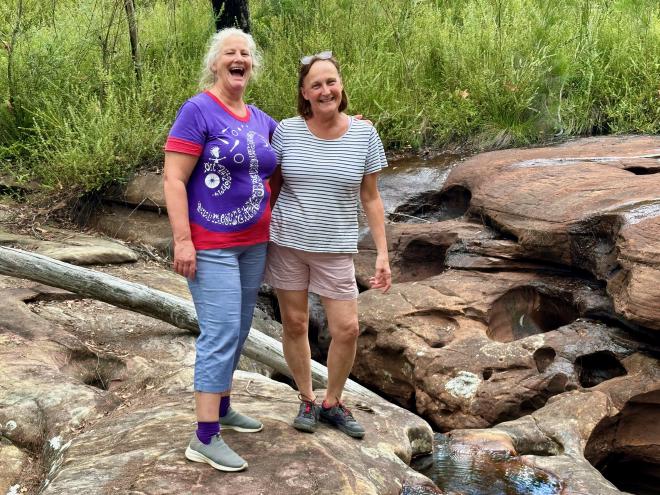 Liz picked us up at the Sutherland train station, which is near her place, a bit later than expected due to the absolutely bonkers pre-Christmas Saturday traffic. After we got ourselves settled in, we headed out for a walk in Royal National Park, which is directly across the street from Liz’s house. This is Karen and Liz on the falls at Temptation Creek, which Liz had expected to be flowing strongly after the recent rains. As you can see it was actually quite dry – the rain must have fallen in another catchment.
