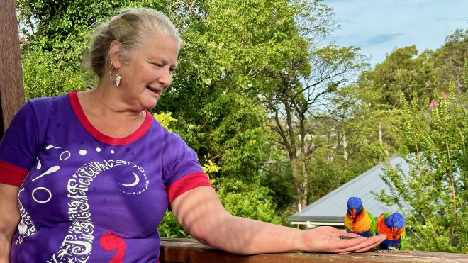 Back at Liz’s place we sat for a bit on the back deck, which immediately attracted the attention of the neighbourhood birds. These are Rainbow Lorikeets. They’re quite used to people and happy to eat from your hands, with a bit of coaxing.