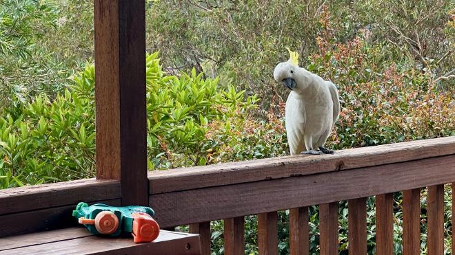 And this is a Sulphur-crested Cockatoo. You’ll notice he isn’t being fed – Liz discourages the Cockatoos from visiting as they have a tendency to destroy the wood on the deck. Cockatoos are also flocking birds, who send out scouts for food, so if you feed one of them you’ll shortly have twenty come to visit. The water pistol at left is for chasing them off. They’re smart birds; all you have to do is pick up the pistol and they’re gone (which saves on water refills, so win-win).