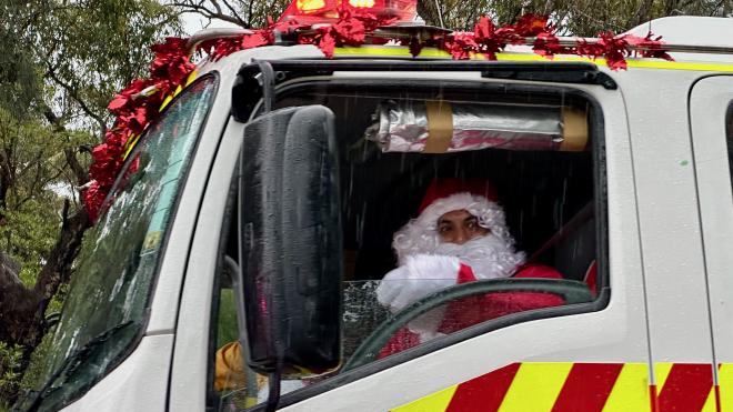 In the late afternoon the local volunteer fire department had a mini-parade of two trucks, carrying a very important visitor who threw candies to the kids.