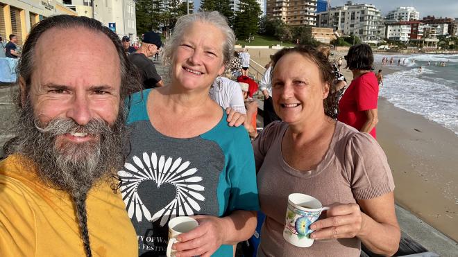 Liz belongs to a women’s swim group that calls themselves the Mermaids. They normally meet to swim two mornings a week, and also have a special Christmas swim. So, on Christmas morning we were all up at 6:30 to get dressed and drive to South Cronulla Beach for a 7:30 dip in the ocean. We were warmly welcomed by the rest of the group and both made honorary Mermaids for the day (Greg being the only mermaid-dude). The surf was unusually heavy, so rather than go out for the swim around the buoy that they usually do, the Mermaids satisfied themselves by getting bashed around in the waves a while. Here we are with our post-swim coffee, which Liz brought along in a thermos in the (correct) expectation that the beach coffee shop would be closed. As you can see in the background, there were lots of other groups also out for an early Christmas-morning swim.