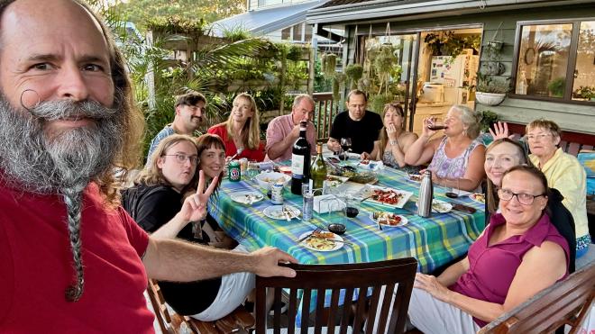 This was dinner, served on Liz’s back deck. Going around the table starting from Greg, we have Kyle (Liz’s eldest), Sophie (Kyle’s wife), Tyler , Hayley (Tyler’s girlfriend), Grant (Liz’s partner), Martin (Louise’s partner), Louise, Karen, Margaret, Bec, and Liz.