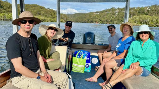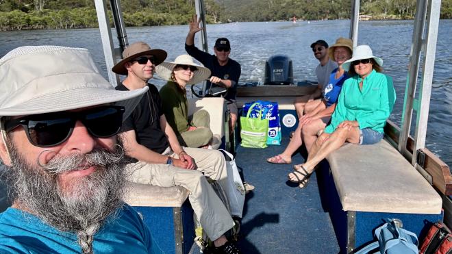 Grant owns a barge, which we would probably call a “flat bottomed boat” in Canada. On the morning of the 27th he was first down to the launch at the Swallow Rock Jetty and we joined him right after breakfast for a morning on the water. Marg wasn’t feeling excited about going for a ride and Bec stayed behind to keep her company.