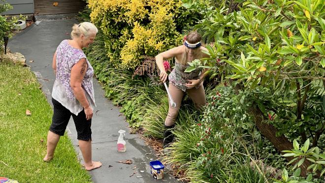 As one last family bonding experience before Louise’s departure, she, Karen and Liz had a go at removing the stinkbugs that had invaded one of Liz’s shrubs.