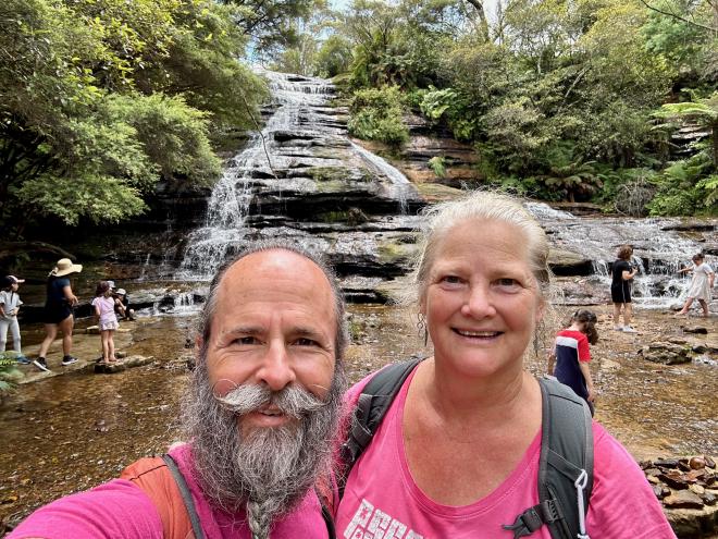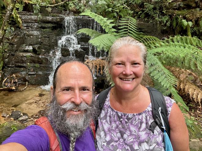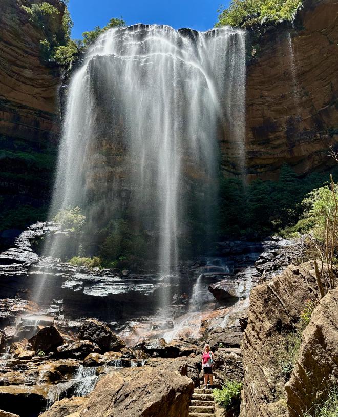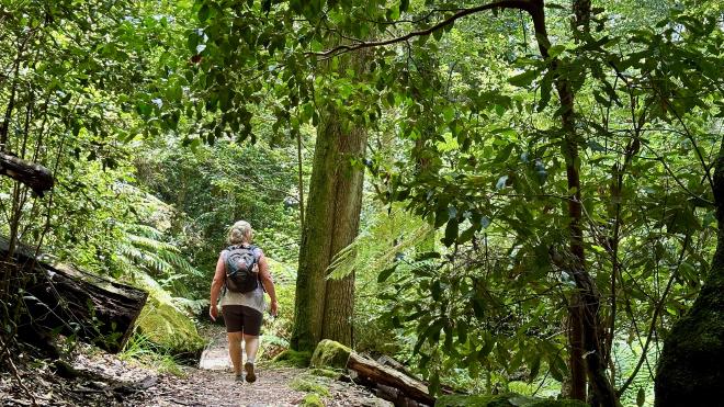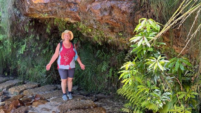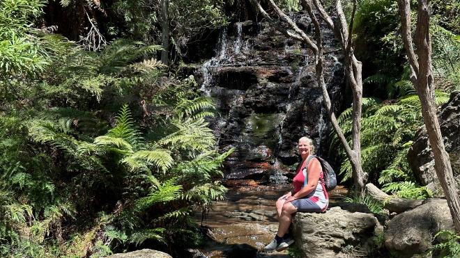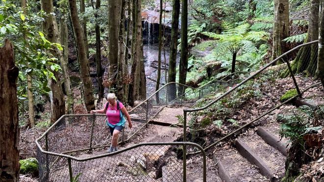 The Round walking track goes part-way down to the valley floor, then back up again. Here is Karen on the climb back up, with Witches Leap falls in the background.