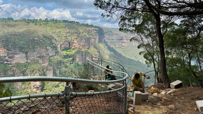 The tracks are under constant maintenance. These stonemasons were rehabilitating one of the lookouts along the Prince Henry Cliff walk.