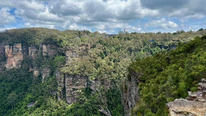 If you look really closely at this photo you can see a building near the centre on the cliff top, a suspended cable car just to its right, and the bottom end of a funicular railway at the lower left. These are part of Scenic World, which has offered “the world’s steepest passenger train” since 1945. We decided to give it a miss.
