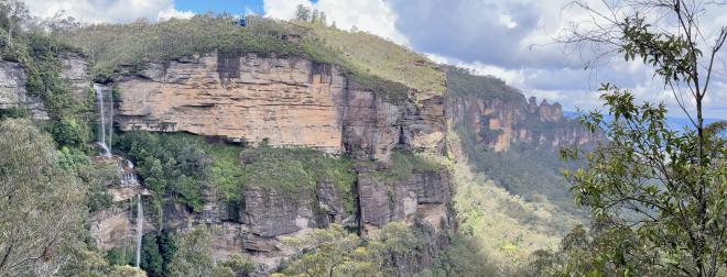 Here’s a wider view from a bit farther down the track, showing Katoomba Falls at left and the Three Sisters at right. The Scenic World cable car is a blue dot near the top, about a third of the way from left.