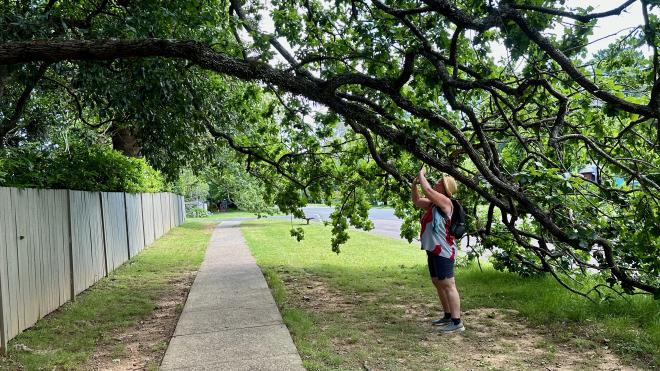We walked from the lookout back to the Wentworth Falls train station, where we hopped the next train back to Katoomba. Along the way we went under this interesting bent tree, and of course Karen had to take a picture.