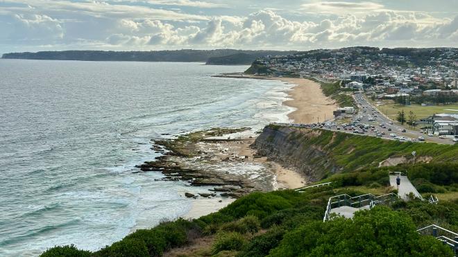 Greg went out for a run on our first evening in town, before the weather closed in. The route looked flat on the map, being along the coast, but it turns out Newcastle has some serious hills with seaside cliffs, so it was a bit more up and down than he’d bargained for. This is the view from Newcastle Memorial Walk looking toward Bar Beach, which we didn’t swim at. Newcastle has lots of beaches.