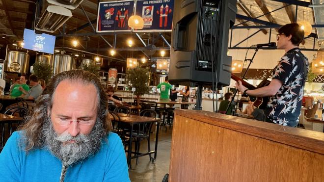We didn’t do much tourist-ing on the 15th or the 16th. On the evening of the 16th we headed out to the Foghorn Brewery for beer and dinner. There was a large contingent of deaf people there, at least some of whom seemed to be in town for the Australian Deaf Games, which were being hosted in Newcastle from 13–20 January. The guy with the guitar in this photograph is David Macmichael, who was hosting an open mic night. We chatted with him briefly between sets; turns out he’s from Dartmouth, Nova Scotia, moved to Newcastle “temporarily” with his Australian now-wife at the beginning of COVID, and doesn’t plan on leaving.
